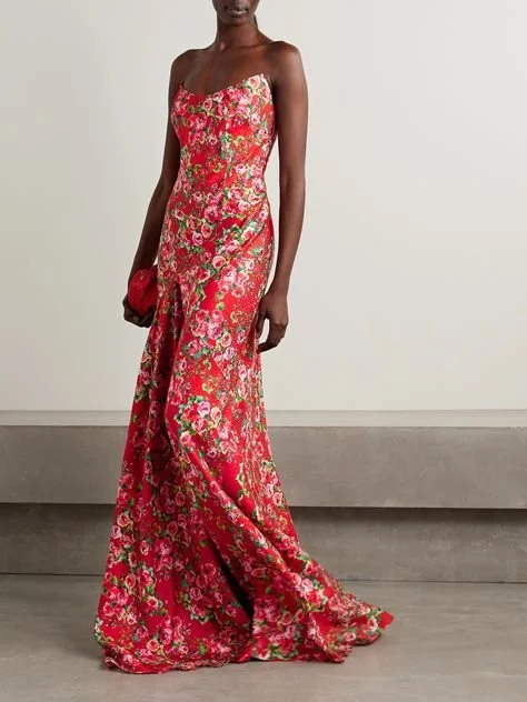 〰️ Red or Orange 〰️ Black Tie 〰️ Floor Length 〰️ Any Neckline 〰️ Any Material 〰️ Texture Encouraged 〰️ Print Encouraged